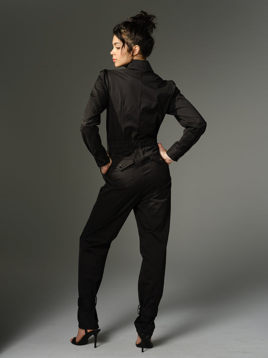 THE WOOLF Jumpsuit - Long Sleeve in Black Cotton Sateen