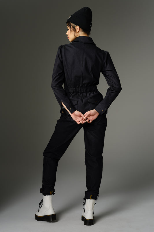 THE WOOLF Jumpsuit in Long Sleeve Deep Indigo Stretch Denim
